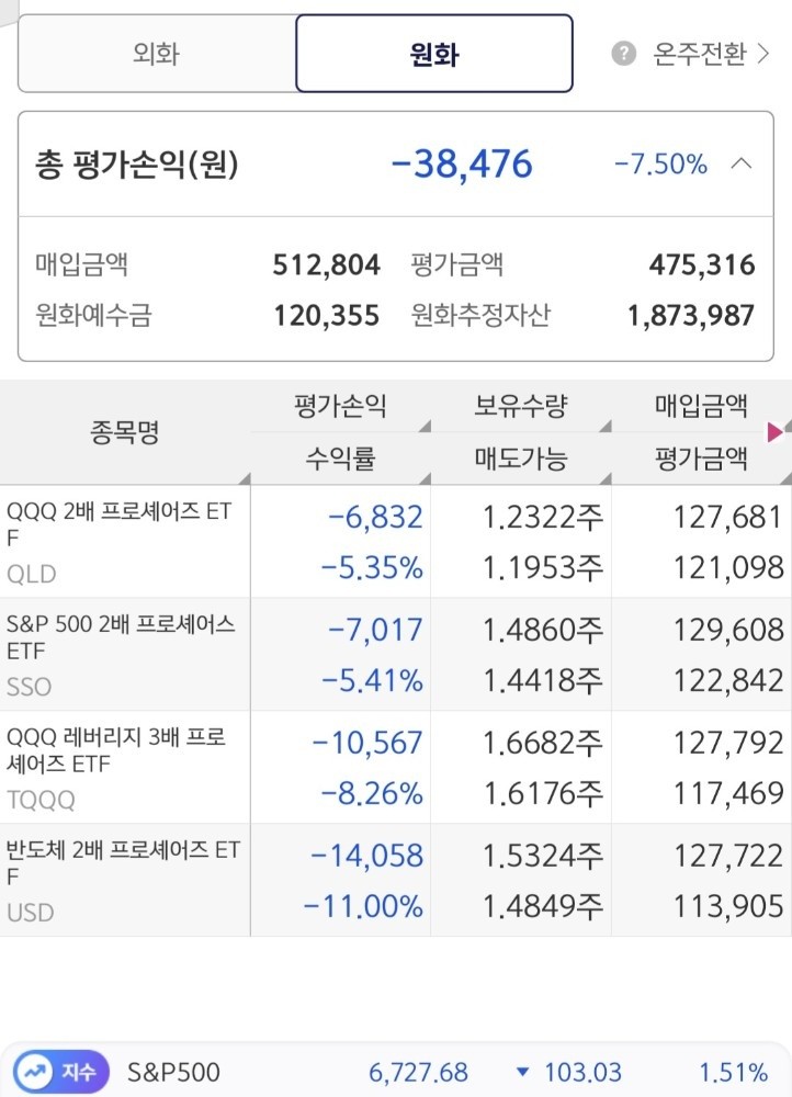 | 레버리지 계좌 | TQQQ, QLD, USD, SSO | -6.94% | -65,324원 |