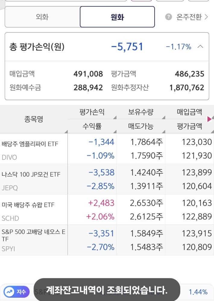 | 배당/인컴 계좌 | SCHD, DIVO, JEPQ, SPYI | -2.21% | -17,639원 |