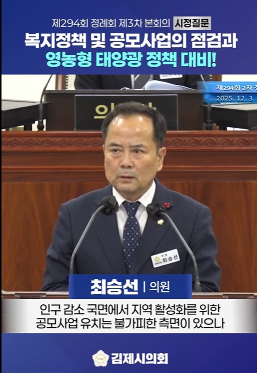 어느덧 한 해를 마무리하는 시점입니다. 저는 지난 12월 3일, 제294회 제2차 정례회 제3차 본회의 시정질문을 통해 우리 김제시의 지속 가능한 미래를 위한 세 가지 핵심 현안을 짚고, 시장님의 답변과 약속을 이끌어냈습니다.