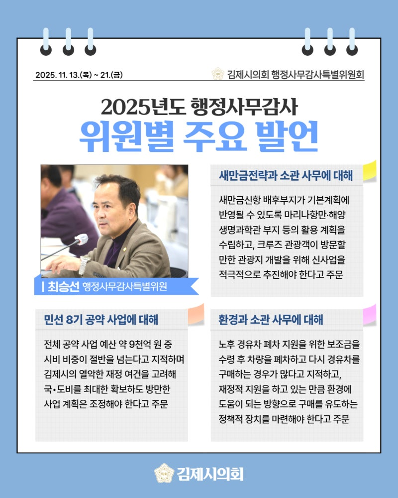 이번 시정질문의 핵심은 ‘이환위리(以患爲利)’, 즉 위기를 기회로 바꾸는 지혜였습니다. 복지 예산의 효율화, 공모사업의 책임감 있는 관리, 그리고 미래 에너지 산업의 선점까지. 저 최승선은 김제시가 겉모양만 큰 도시가 아닌, 시민의 삶이 실질적으로 풍요로워지는 내실 있는 도시가 되도록 끝까지 살피겠습니다.