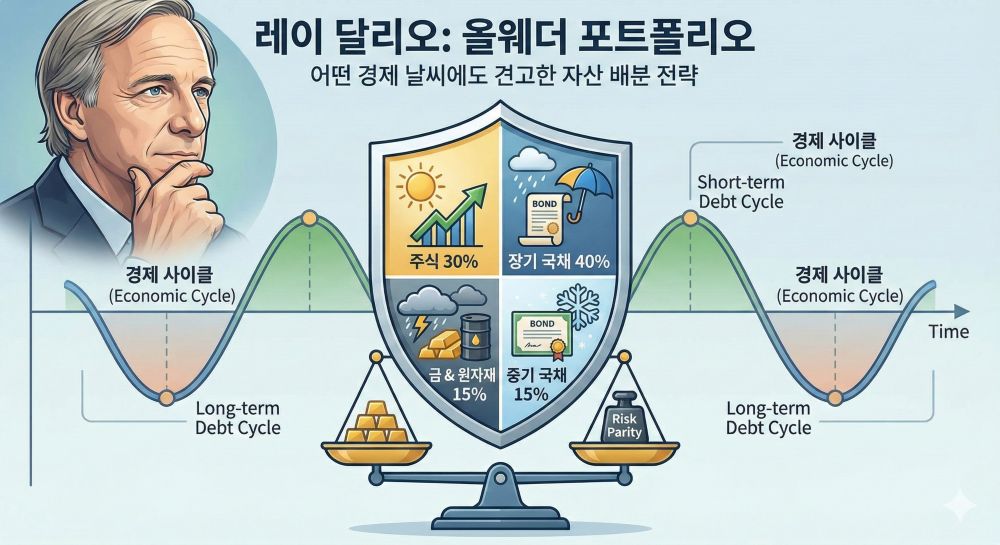 제레미 시겔의 배당주나 존 보글의 인덱스 펀드를 적립식으로 모아가고 있다면, 레이 달리오의 전략은 그 자산을 **’지키는 울타리’**가 됩니다.